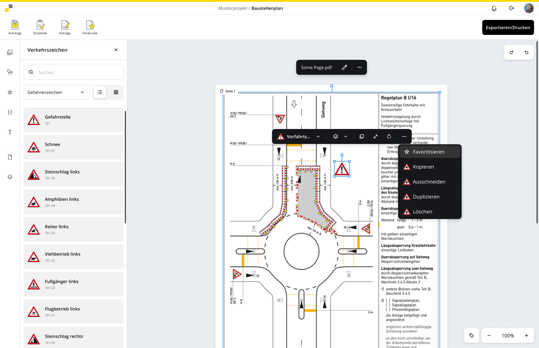Komplexe Bearbeitungsmasken wurden durch kontext-sensitive Menüs ersetzt. Verkehrszeichen, Regelpläne und Texte lassen sich direkt in die Arbeitsfläche integrieren, ohne den Arbeitsfluss zu unterbrechen. Durch smarte Interaktionsmuster reagiert das System dynamisch auf die jeweilige Arbeitssituation. Die Nutzerführung ist logisch aufgebaut, sodass sowohl erfahrene Planer als auch neue Nutzer effizient arbeiten können.