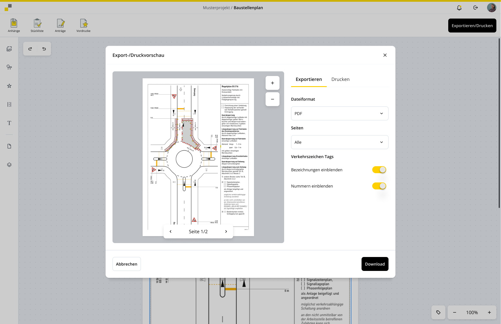 Der Verkehrszeichen-Planer vereint präzise Planung, intuitive Bedienung und moderne Technologie. Die optimierte Informationsarchitektur, das durchdachte Interaktionsdesign und das skalierbare UI-System machen die Anwendungleistungsstärker als je zuvor. Das Ergebnis ist eine Web-Anwendung, die komplexe Prozesse vereinfacht, den Arbeitsfluss beschleunigt und die Nutzer in ihrem gesamten Planungsprozess unterstützt.