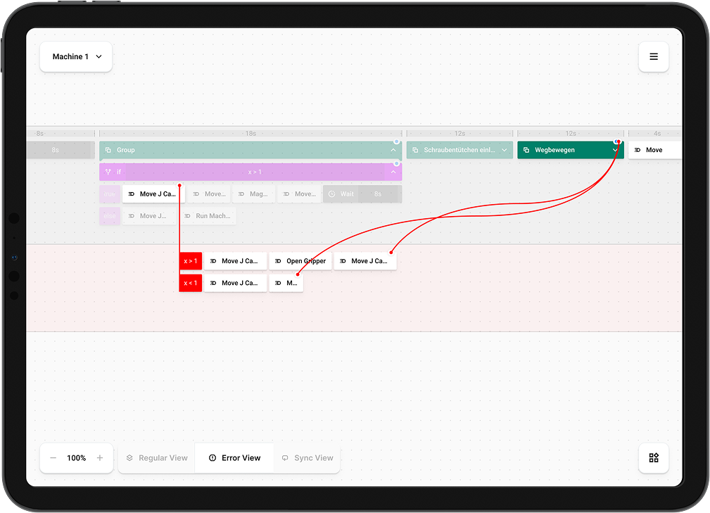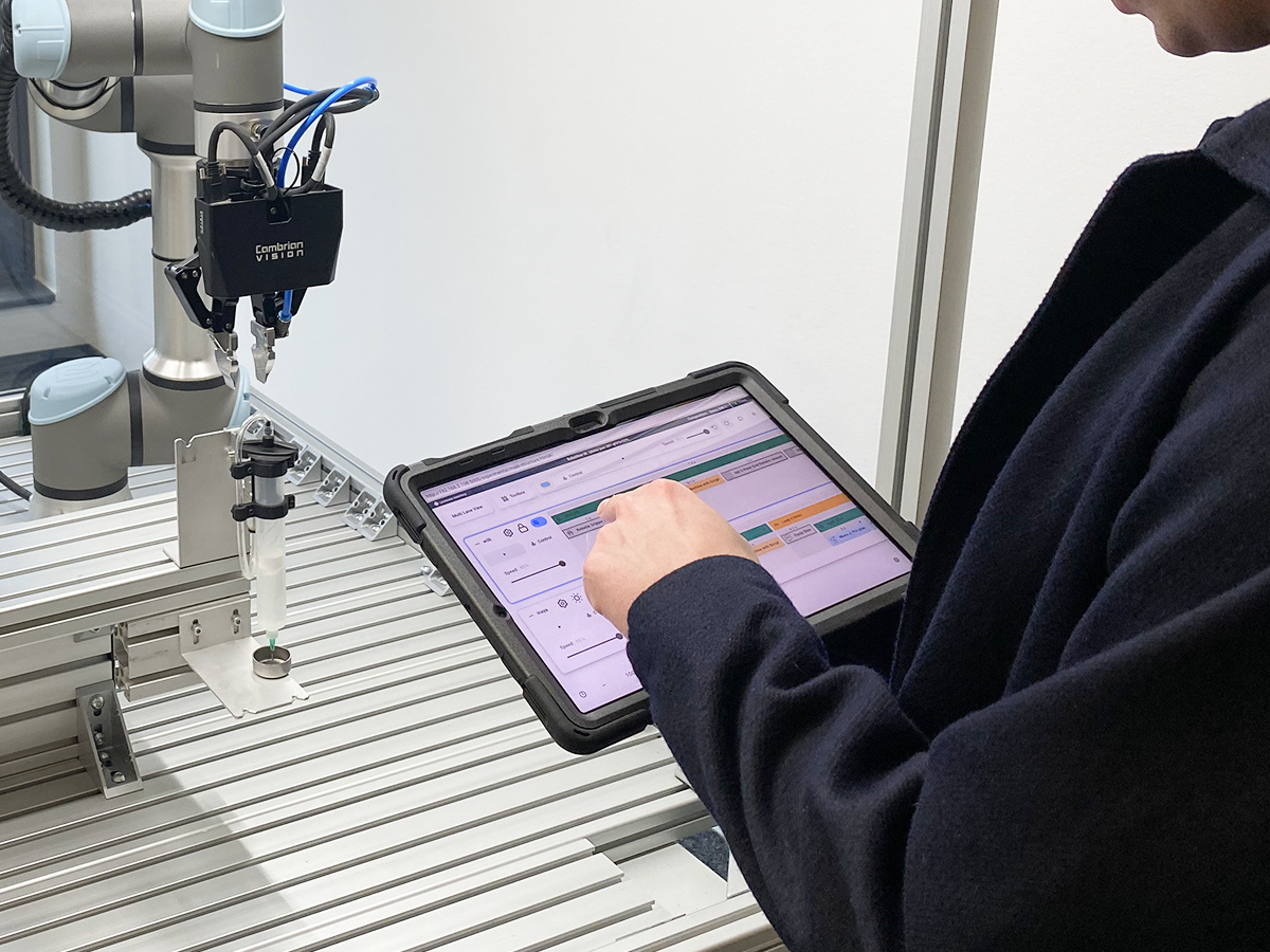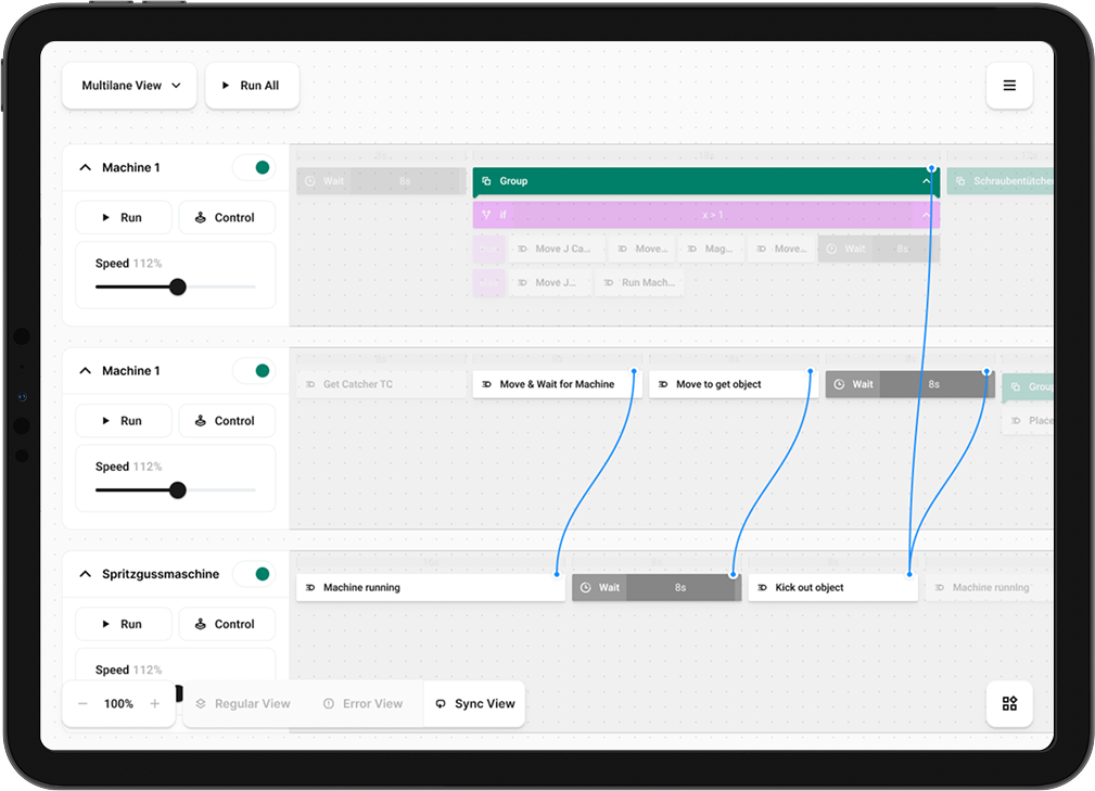 Mensch, Hard- und Software nahtlos zu verbinden – das war unser Anspruch. Die Steuerung erfolgt durch eine Kombination aus grafischem User Interface, Drag-and-Drop-Programmierung und direkter Interaktion mit dem Roboter. Während der Ausführung stehen zentrale KPIs wie Taktzeiten und Produktionszahlen im Fokus. So können Nutzer ihre Prozesse nicht nur steuern, sondern auch optimieren und vorausschauend anpassen.