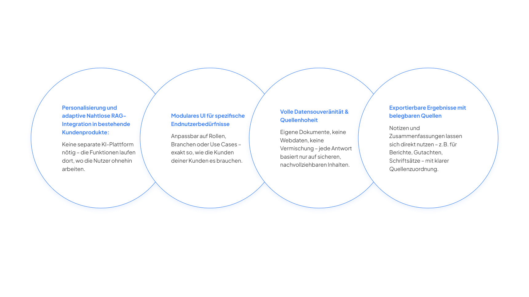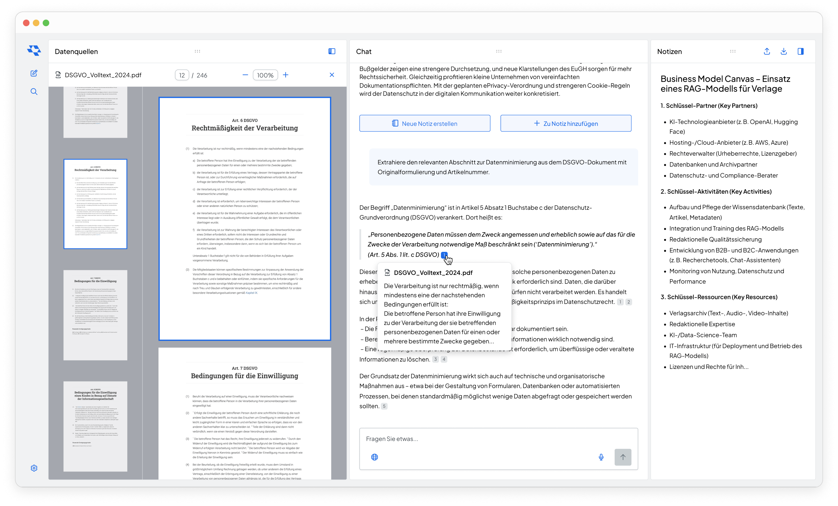 Dies bedeutet maximale Nachvollziehbarkeit, schnelle Verifizierung und rechtssicheres Arbeiten. Ob als interne Wissensdatenbank, Compliance-Lösung oder Verlagstool: Unser RAG-Chat bildet die flexible Grundlage für maßgeschneiderte KI-Produkte.
