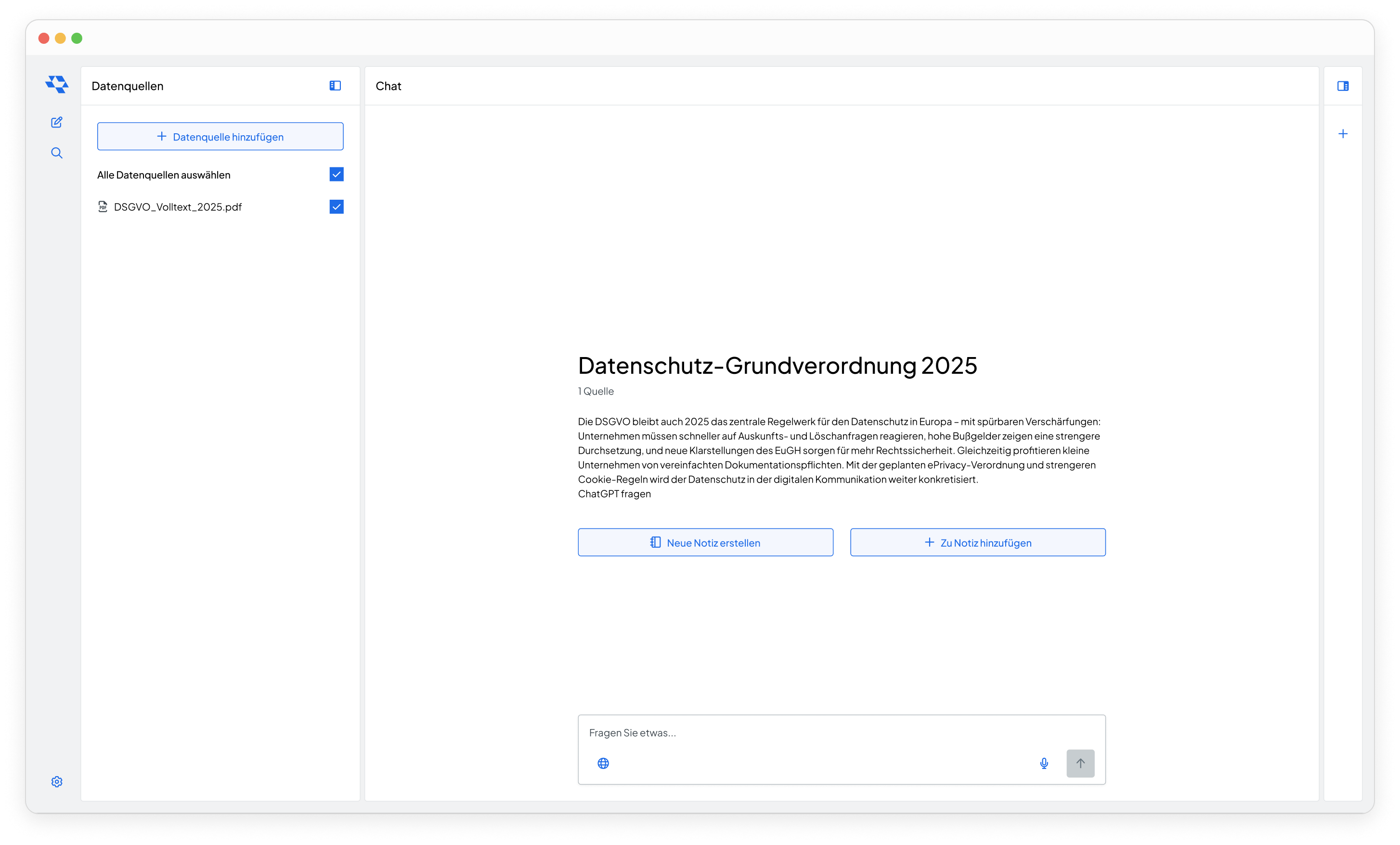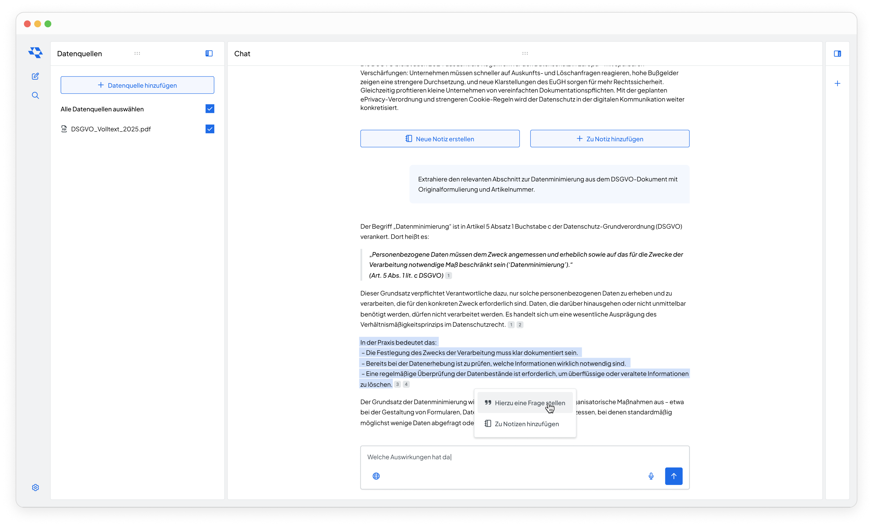 Anstelle kryptischer Suchanfragen führen Nutzer einen echten Dialog mit ihren Dokumenten. Sie erhalten präzise, kontextbezogene Antworten, die direkt aus den Inhalten der hochgeladenen Dateien abgeleitet sind. ede KI-Antwort ist mit der exakten Textstelle im Originaldokument verknüpft.